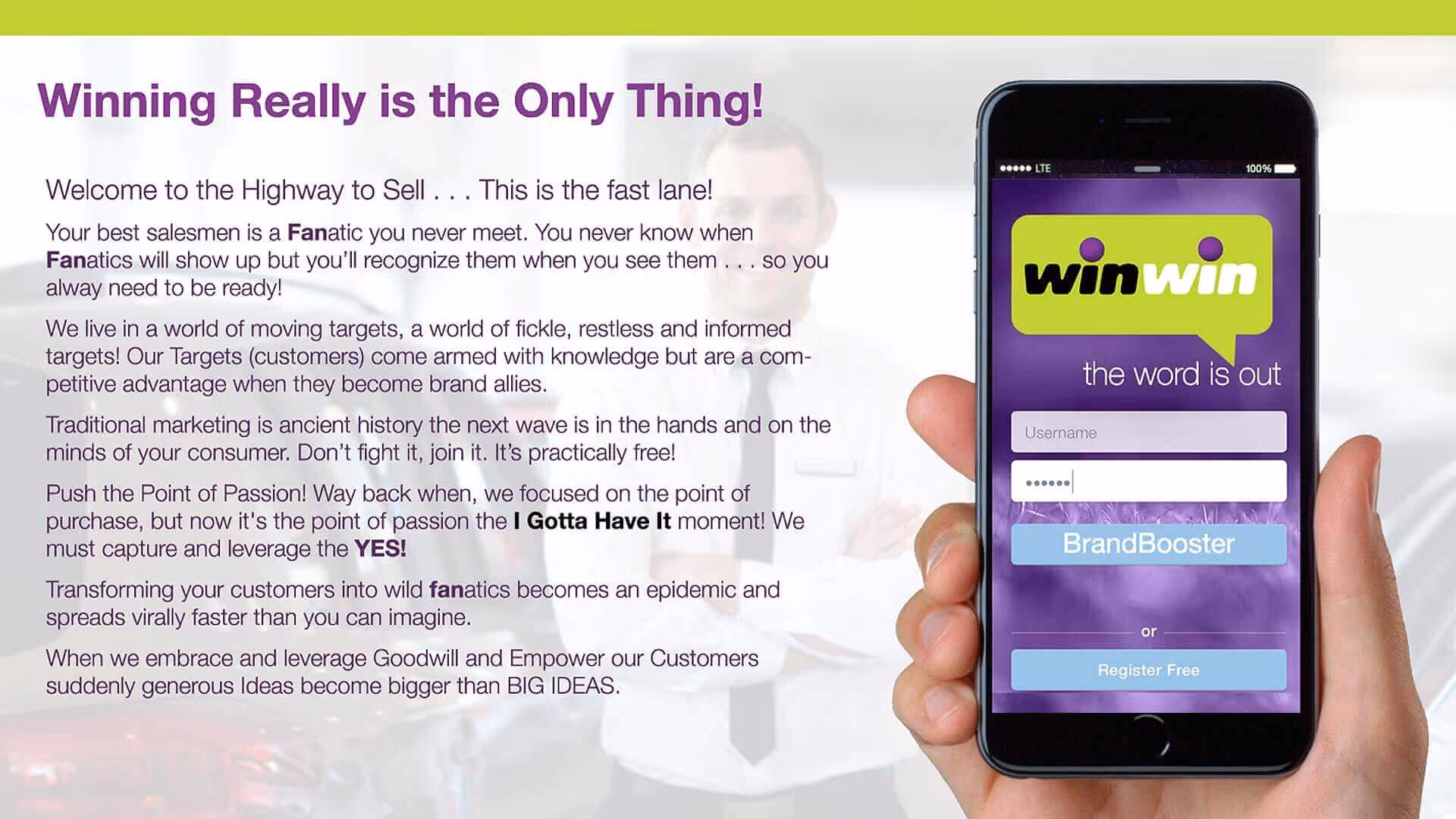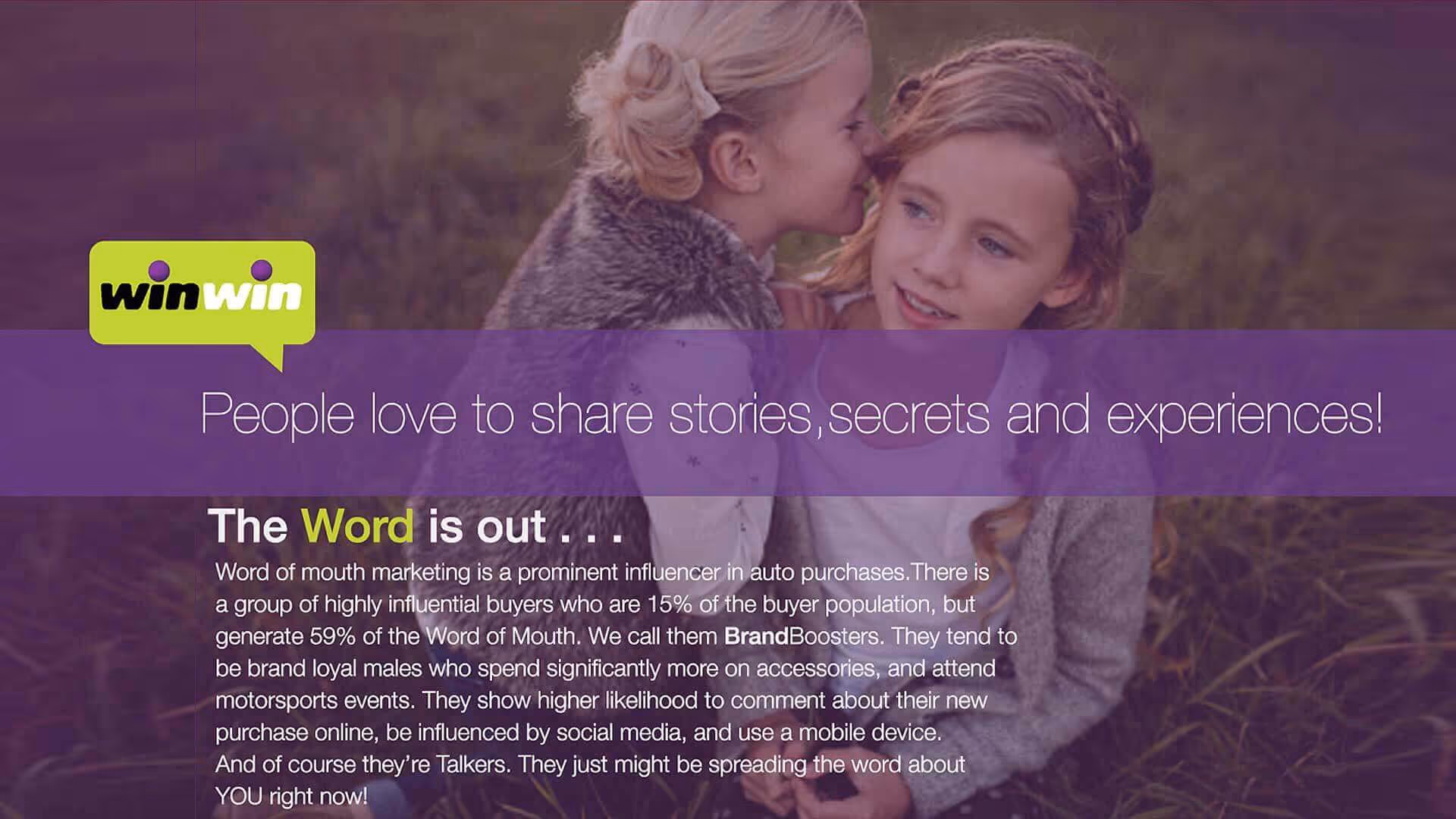 Win-Win engaged Plumb to develop, design and deploy a digital solution to increase word-of-mouth auto sales. Our communications strategy was to focus on the personal passion at the precise moment of purchase, when the keys are handed over. Buying a car is time-consuming - there are so many options, opinions, data, research, trends, cost, test drives and comparisons. Once you find your car, "getting it" is easy - it'll be in your driveway in 24 hours. Our single-minded objective was to capture, elevate and promote the moment of car purchase when the “excitement and joy” are on the hook. Our solution was to develop an application called Bragging Rights. Our creative strategy was to design an easy to use “Instagram-esque” platform to post photographs and selfies of the proud owner with their new baby (car). Bragging Rights also encouraged the consumer to rate the buying process, the overall experience, the sale and the friendly factor. Buyers still in the "tire-kicking" stage could also created a wish list of the perfect value. The incentive was not just Bragging rights but also discounts on checkups, tune ups, accessories and a $300 cash incentive for any referrals. Bragging Rights enables car buyers to share the joy instantly but it also Influences the perceptions and purchases of friends and family.